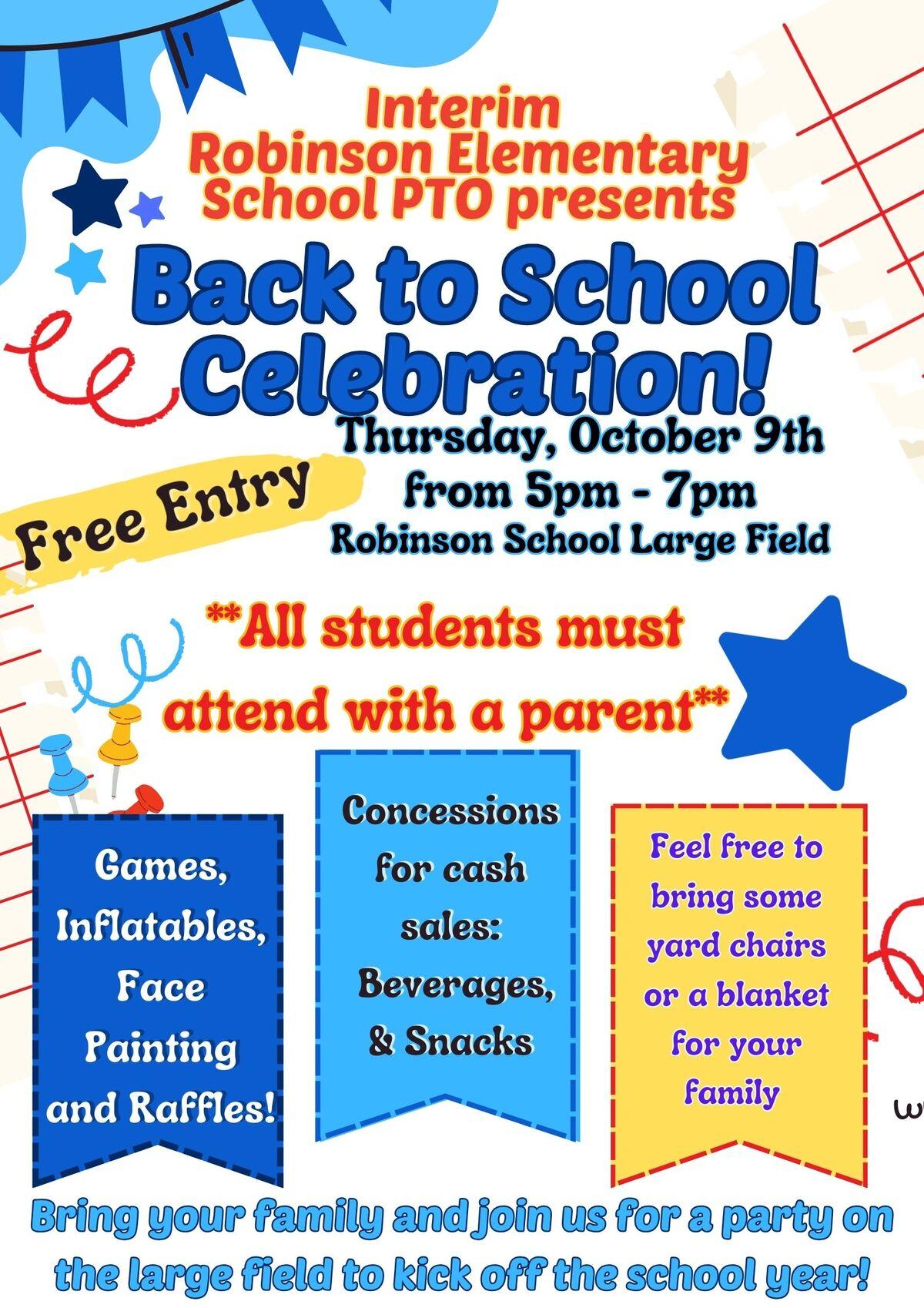 Back to School Celebration! October 9th5pm -7pmBring your family and join us for a back to school bash! See the flyer for more information!
